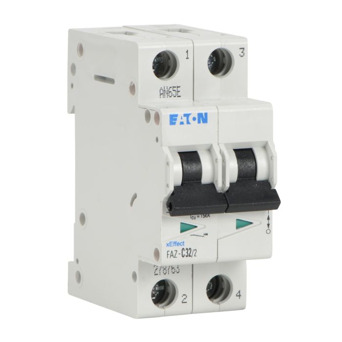Eaton miniature supplementary protector, 32A, 480Y / 277 VAC / 96 VDC, 2-pole, C curve, thermal magnetic, 10kA SCCR, 35mm DIN rail mount.