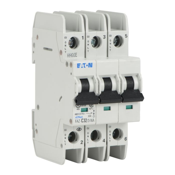 Eaton miniature circuit breaker, current-limiting, 32A, 480Y / 277 VAC / 96 VDC, 3-pole, C curve, thermal magnetic, 10kA SCCR, 35mm DIN rail mount.