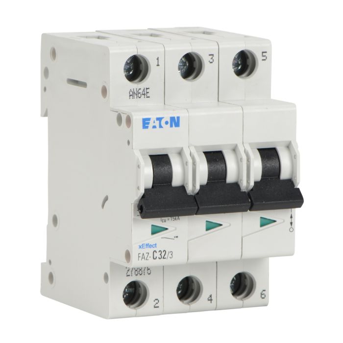 Eaton miniature supplementary protector, 32A, 480Y / 277 VAC / 96 VDC, 3-pole, C curve, thermal magnetic, 10kA SCCR, 35mm DIN rail mount.