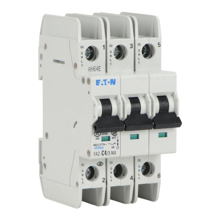 Eaton miniature circuit breaker, current-limiting, 4A, 480Y / 277 VAC / 96 VDC, 3-pole, C curve, thermal magnetic, 10kA SCCR, 35mm DIN rail mount.