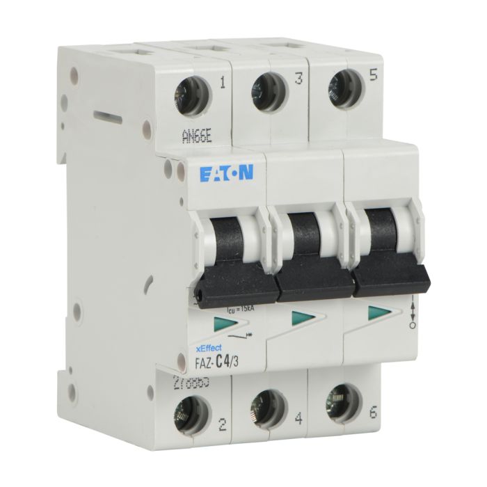 Eaton miniature supplementary protector, 4A, 480Y / 277 VAC / 96 VDC, 3-pole, C curve, thermal magnetic, 10kA SCCR, 35mm DIN rail mount.