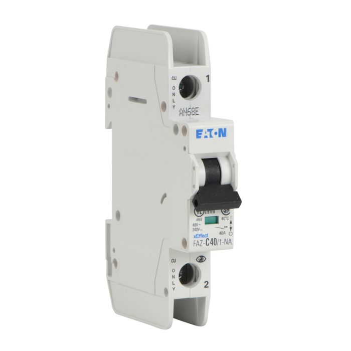 Eaton miniature circuit breaker, current-limiting, 40A, 240 VAC / 48VDC, 1-pole, C curve, thermal magnetic, 10kA SCCR, 35mm DIN rail mount.