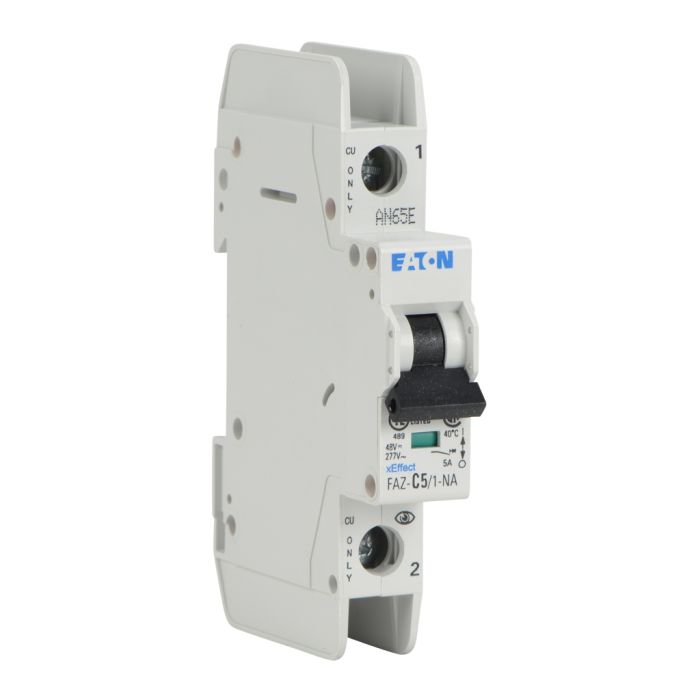 Eaton miniature circuit breaker, current-limiting, 5A, 277 VAC / 48 VDC, 1-pole, C curve, thermal magnetic, 10kA SCCR, 35mm DIN rail mount.