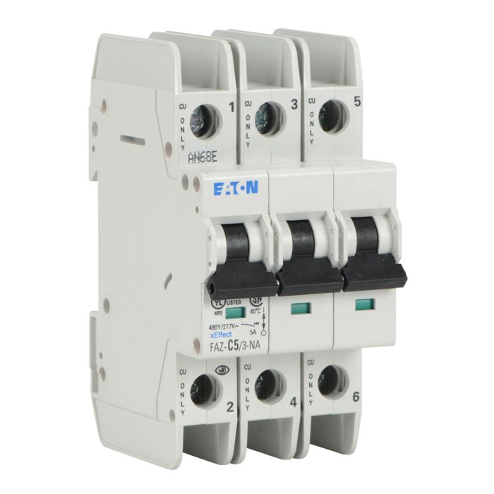 Eaton miniature circuit breaker, current-limiting, 5A, 480Y / 277 VAC / 96 VDC, 3-pole, C curve, thermal magnetic, 10kA SCCR, 35mm DIN rail mount.