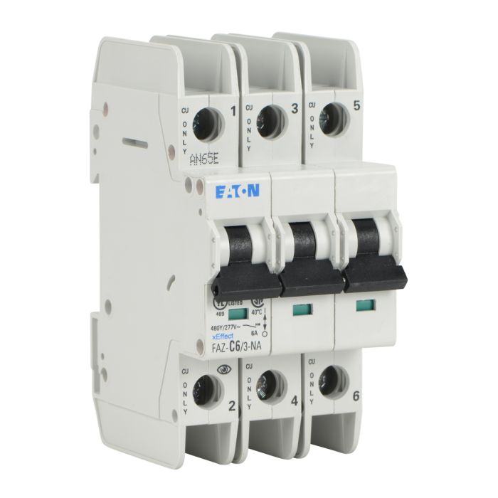 Eaton miniature circuit breaker, current-limiting, 6A, 480Y / 277 VAC / 96 VDC, 3-pole, C curve, thermal magnetic, 10kA SCCR, 35mm DIN rail mount.