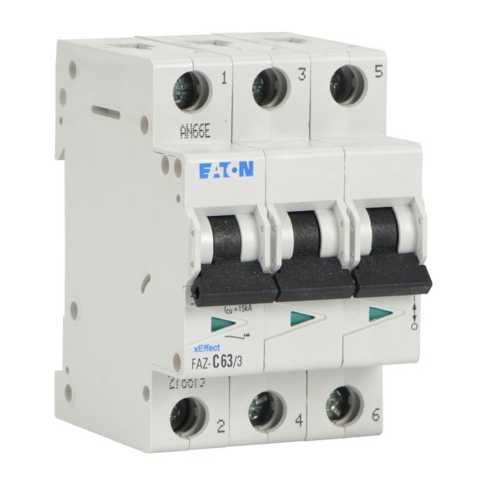 Eaton miniature supplementary protector, 63A, 480Y / 277 VAC / 96 VDC, 3-pole, C curve, thermal magnetic, 5kA SCCR, 35mm DIN rail mount.