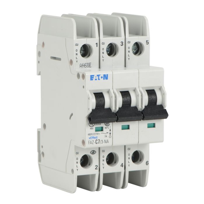 Eaton miniature circuit breaker, current-limiting, 7A, 480Y / 277 VAC / 96 VDC, 3-pole, C curve, thermal magnetic, 10kA SCCR, 35mm DIN rail mount.