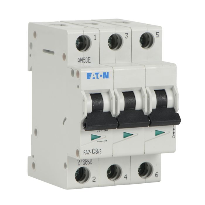 Eaton miniature supplementary protector, 8A, 480Y / 277 VAC / 96 VDC, 3-pole, C curve, thermal magnetic, 10kA SCCR, 35mm DIN rail mount.