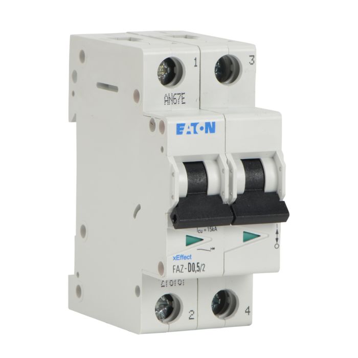Eaton miniature supplementary protector, 0.5A, 480Y / 277 VAC / 96 VDC, 2-pole, D curve, thermal magnetic, 5kA SCCR, 35mm DIN rail mount.