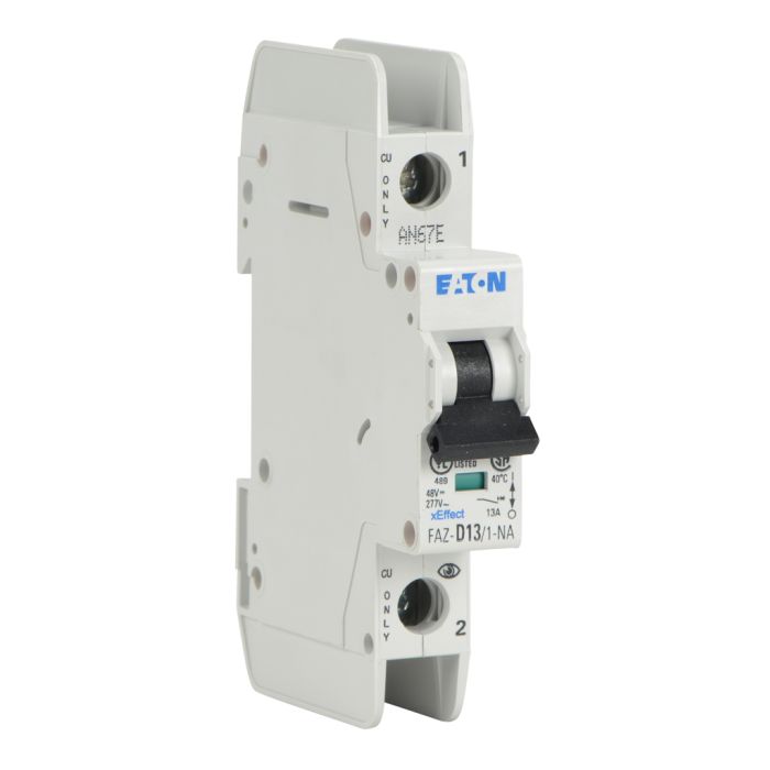 Eaton miniature circuit breaker, current-limiting, 13A, 277 VAC / 48 VDC, 1-pole, D curve, thermal magnetic, 10kA SCCR, 35mm DIN rail mount.