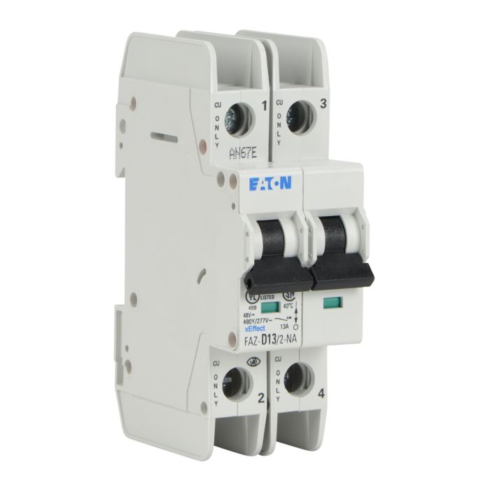 Eaton miniature circuit breaker, current-limiting, 13A, 480Y / 277 VAC / 96 VDC, 2-pole, D curve, thermal magnetic, 10kA SCCR, 35mm DIN rail mount.