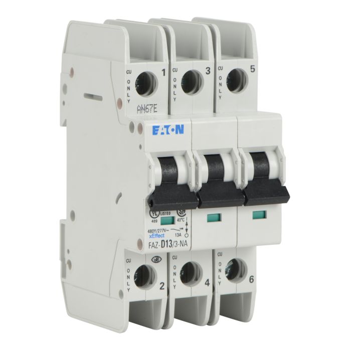 Eaton miniature circuit breaker, current-limiting, 13A, 480Y / 277 VAC / 96 VDC, 3-pole, D curve, thermal magnetic, 10kA SCCR, 35mm DIN rail mount.