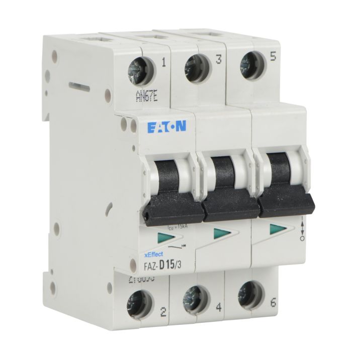 Eaton miniature supplementary protector, 15A, 480Y / 277 VAC / 96 VDC, 3-pole, D curve, thermal magnetic, 5kA SCCR, 35mm DIN rail mount.