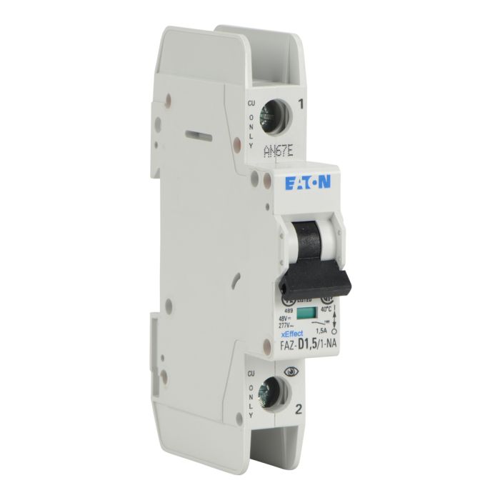 Eaton miniature circuit breaker, current-limiting, 1.5A, 277 VAC / 48 VDC, 1-pole, D curve, thermal magnetic, 10kA SCCR, 35mm DIN rail mount.