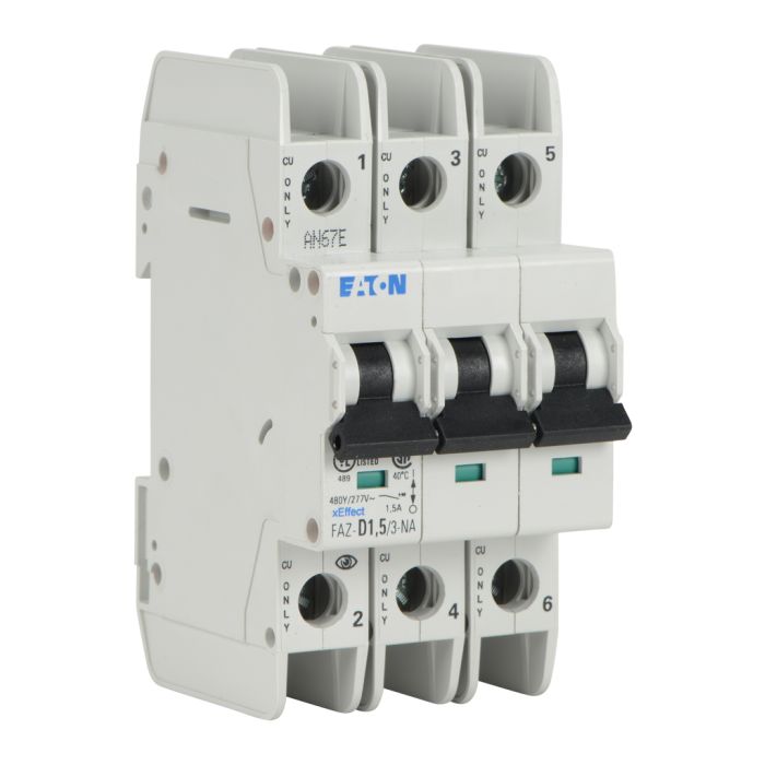 Eaton miniature circuit breaker, current-limiting, 1.5A, 480Y / 277 VAC / 96 VDC, 3-pole, D curve, thermal magnetic, 10kA SCCR, 35mm DIN rail mount.