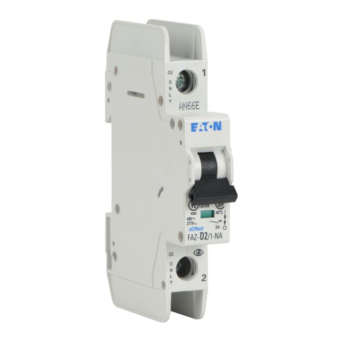 Eaton miniature circuit breaker, current-limiting, 2A, 277 VAC / 48 VDC, 1-pole, D curve, thermal magnetic, 10kA SCCR, 35mm DIN rail mount.