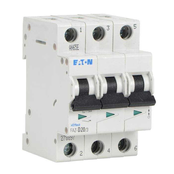 Eaton miniature supplementary protector, 20A, 480Y / 277 VAC / 96 VDC, 3-pole, D curve, thermal magnetic, 5kA SCCR, 35mm DIN rail mount.