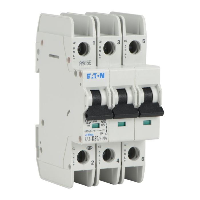 Eaton miniature circuit breaker, current-limiting, 25A, 480Y / 277 VAC / 96 VDC, 3-pole, D curve, thermal magnetic, 10kA SCCR, 35mm DIN rail mount.