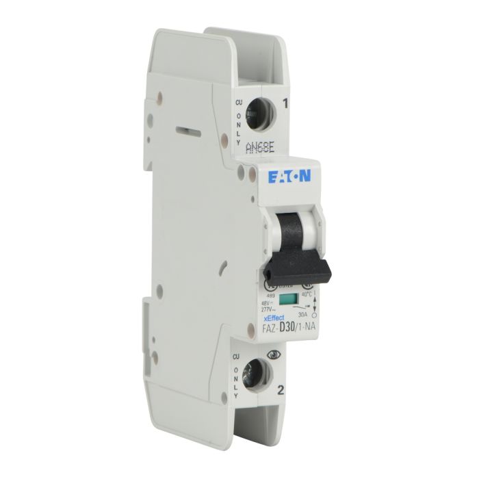 Eaton miniature circuit breaker, current-limiting, 30A, 277 VAC / 48 VDC, 1-pole, D curve, thermal magnetic, 10kA SCCR, 35mm DIN rail mount.