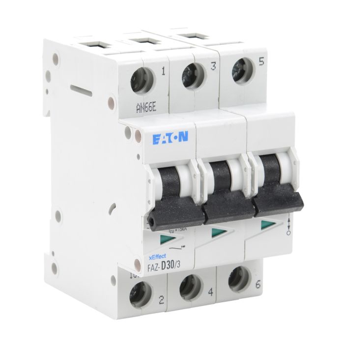 Eaton miniature supplementary protector, 30A, 480Y / 277 VAC / 96 VDC, 3-pole, D curve, thermal magnetic, 5kA SCCR, 35mm DIN rail mount.