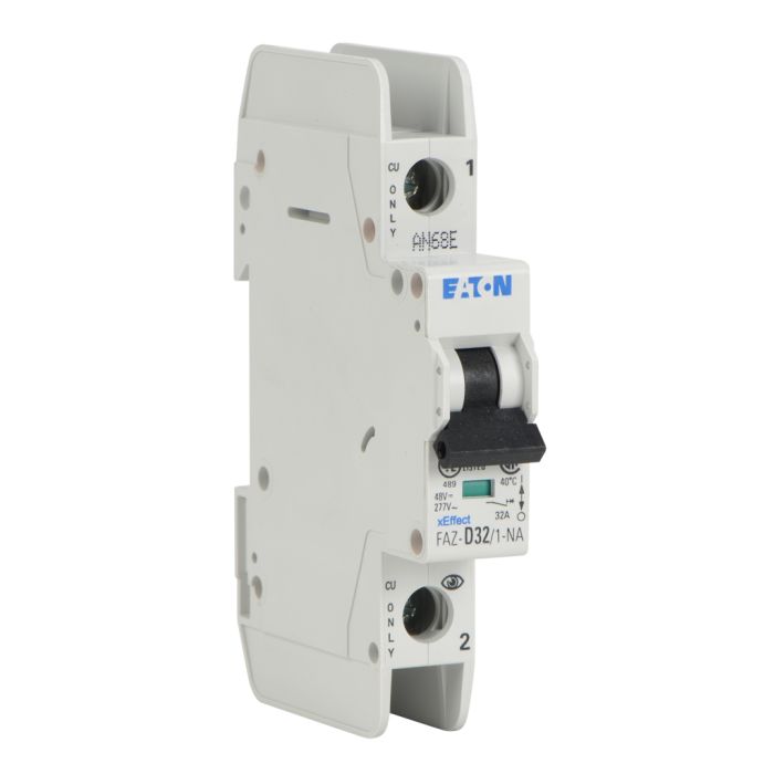 Eaton miniature circuit breaker, current-limiting, 32A, 277 VAC / 48 VDC, 1-pole, D curve, thermal magnetic, 10kA SCCR, 35mm DIN rail mount.