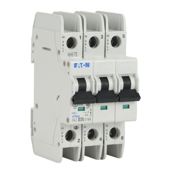 Eaton miniature circuit breaker, current-limiting, 35A, 240 VAC / 48VDC, 3-pole, D curve, thermal magnetic, 10kA SCCR, 35mm DIN rail mount.