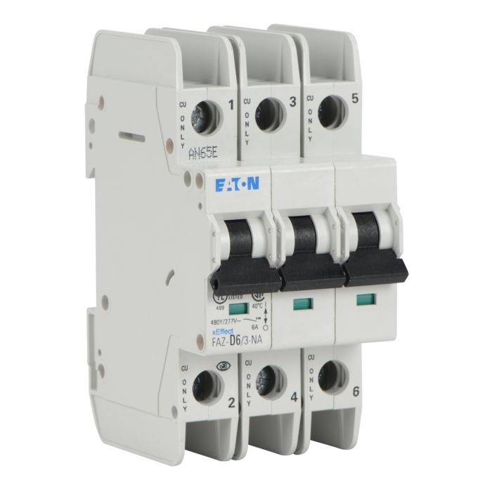 Eaton miniature circuit breaker, current-limiting, 6A, 480Y / 277 VAC / 96 VDC, 3-pole, D curve, thermal magnetic, 10kA SCCR, 35mm DIN rail mount.
