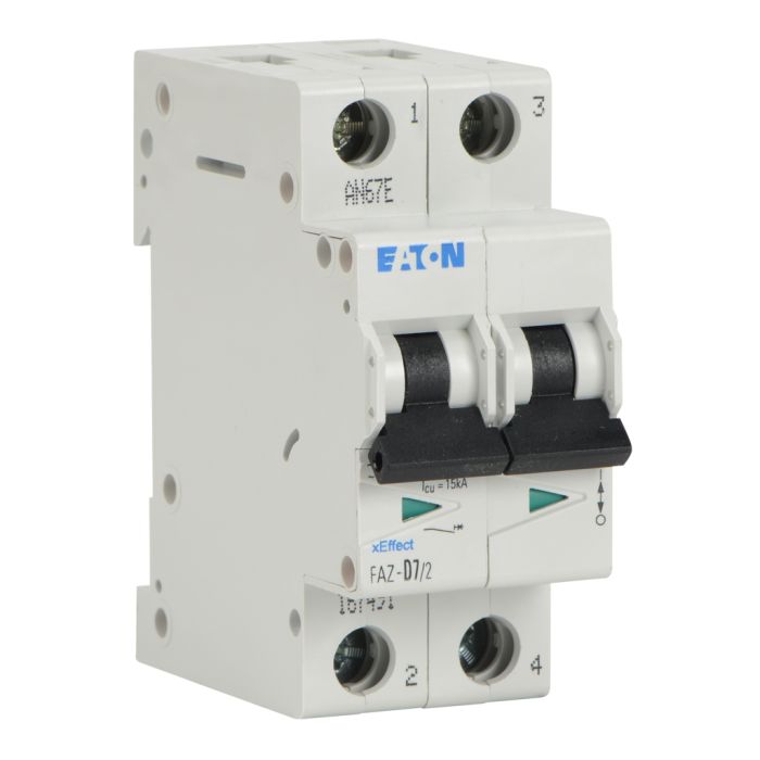 Eaton miniature supplementary protector, 7A, 480Y / 277 VAC / 96 VDC, 2-pole, D curve, thermal magnetic, 5kA SCCR, 35mm DIN rail mount.