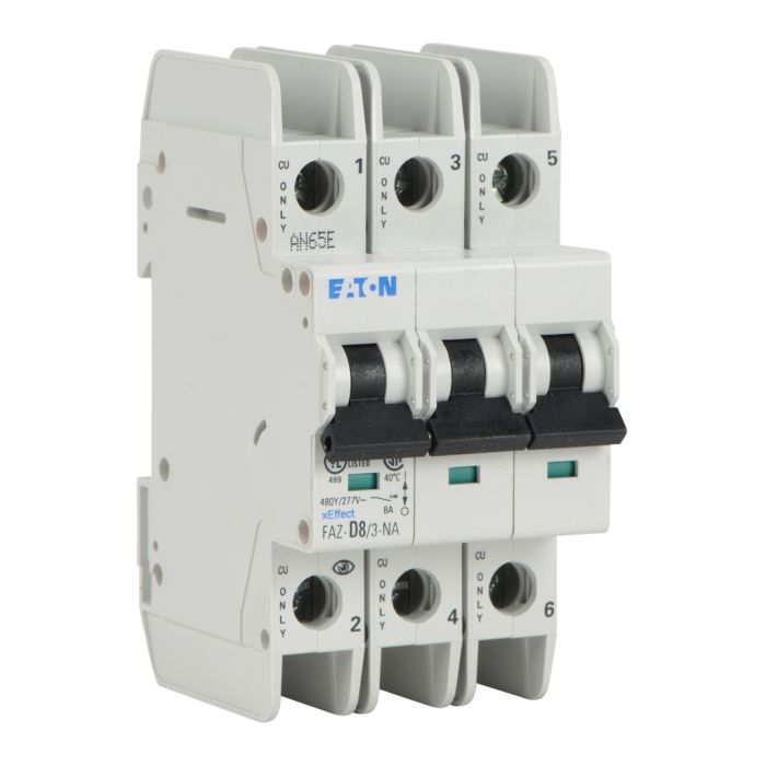 Eaton miniature circuit breaker, current-limiting, 8A, 480Y / 277 VAC / 96 VDC, 3-pole, D curve, thermal magnetic, 10kA SCCR, 35mm DIN rail mount.