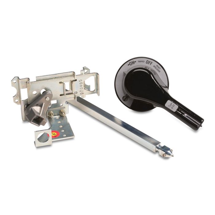 Handle, pistol, position indicating, black, external front mount, defeatable, lockable, NEMA 4/4X. For use with F-frame model MCCBs. 12in shaft and operator included.