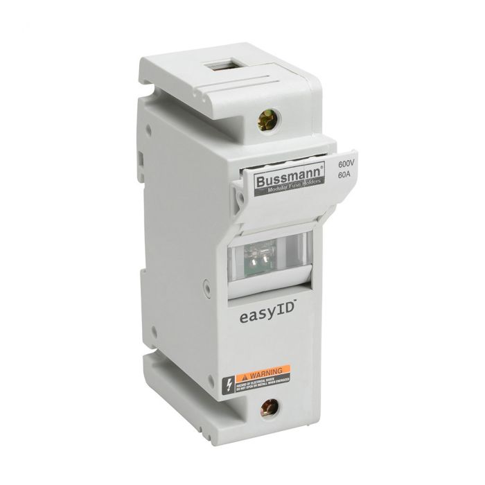 Edison modular fuse holder, with indicator, accepts Class J fuses, 60A, 600 VAC/DC (or less), 1-pole, 18-1 AWG copper only, integral pressure plate with separate spade connection, 35mm DIN rail or panel mount. Package of 6.