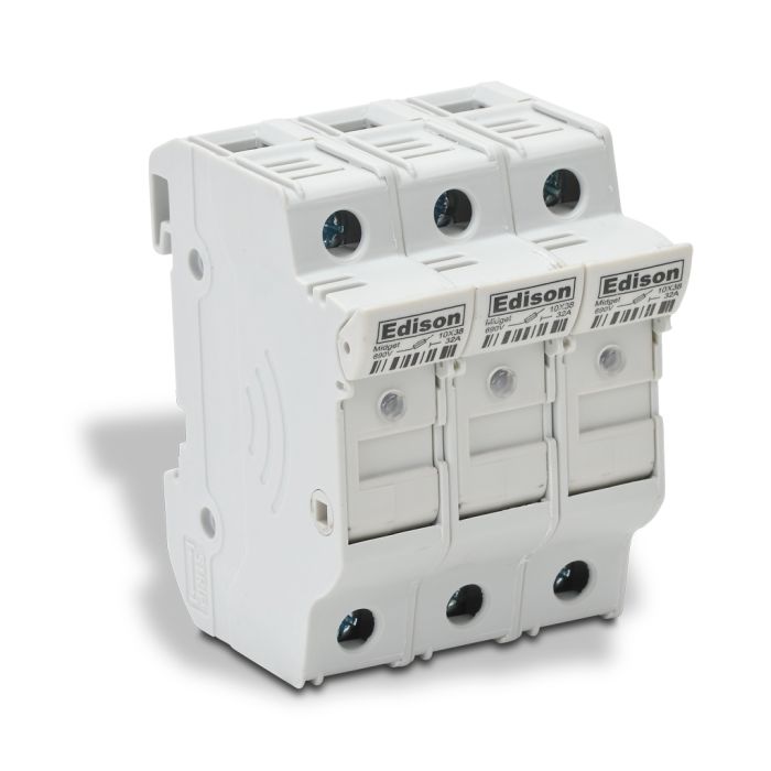 Edison modular fuse holder, with indicator, accepts Class Midget fuses, 30A, 600V, 3-pole, 18-4 AWG copper only, integral pressure plate with separate spade connection, 35mm DIN rail mount.