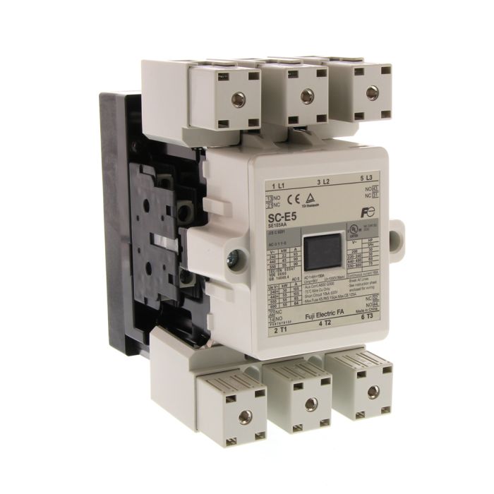 Fuji Electric IEC contactor, 105A, (3) N.O. power poles, 575 VAC (60Hz)/460 VAC (50Hz) coil voltage, low consumption electronic. (2) N.O. and (2) N.C. auxiliary contacts included.