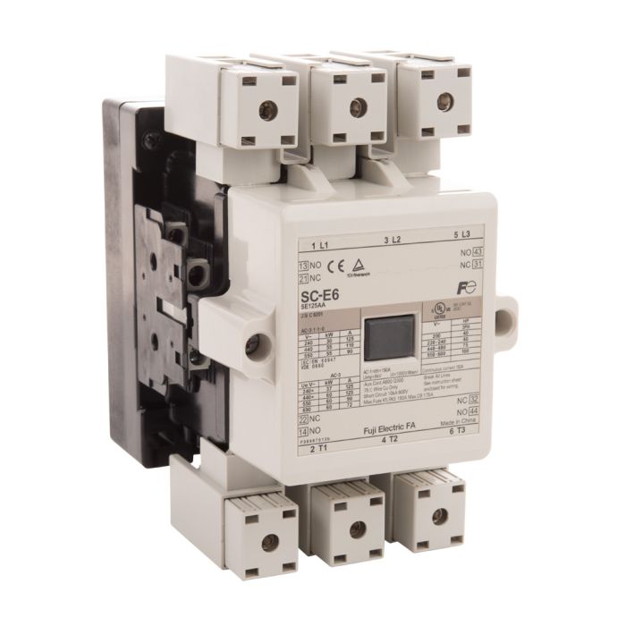 Fuji Electric IEC contactor, 125A, (3) N.O. power poles, 575 VAC (60Hz)/460 VAC (50Hz) coil voltage, low consumption electronic. (2) N.O. and (2) N.C. auxiliary contacts included.