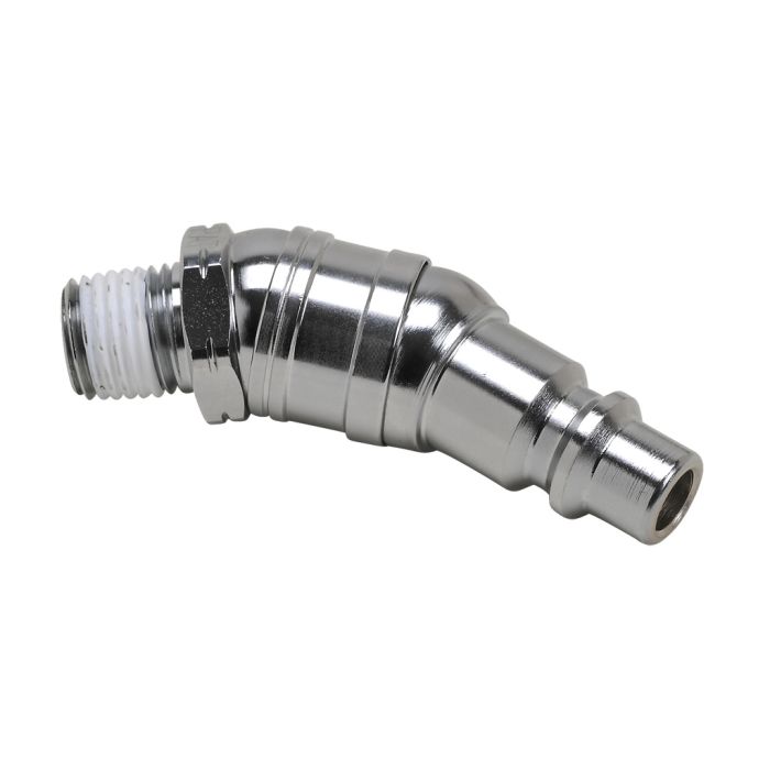 NITRA pneumatic quick disconnect fitting, swivel, chrome-plated steel body, 3/8in industrial interchange plug to 1/4in male NPT.