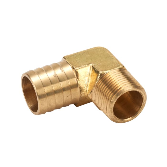 NITRA threaded fitting, hose barb elbow, brass body, brass threads, (1) 1in hose to (1) 3/4in male NPT connection(s). Package of 1.