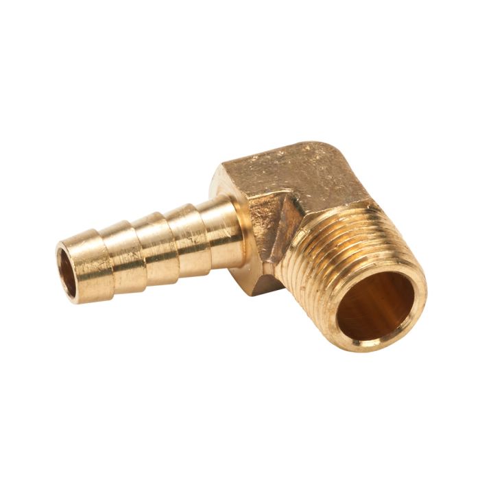 NITRA threaded fitting, hose barb elbow, brass body, brass threads, (1) 3/8in hose to (1) 3/8in male NPT connection(s). Package of 5.
