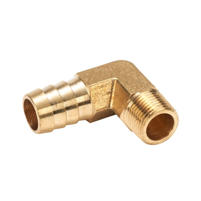 NITRA threaded fitting, hose barb elbow, brass body, brass threads, (1) 5/8in hose to (1) 3/8in male NPT connection(s). Package of 3.