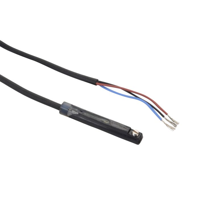 NITRA cylinder switch, round, NPN, N.O. output, 5-28 VDC operating voltage, LED indication, 9.8ft (3.00m) 3-wire pigtail with wire leads, 4mm round slot mount, for position sensing.