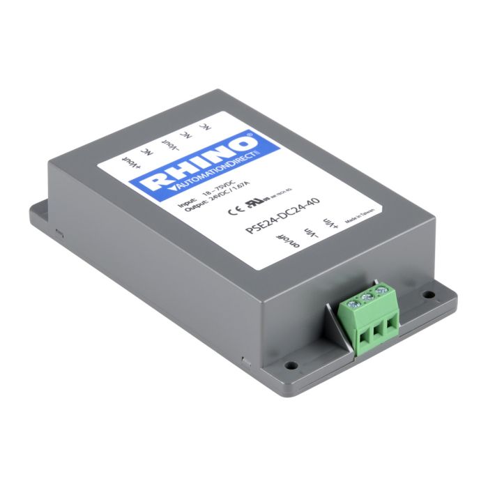 RHINO DC to DC converter, 18 - 75 VDC input, 24 VDC output, 1.67A, 40W, plastic housing, encapsulated, chassis mount, screw terminal.