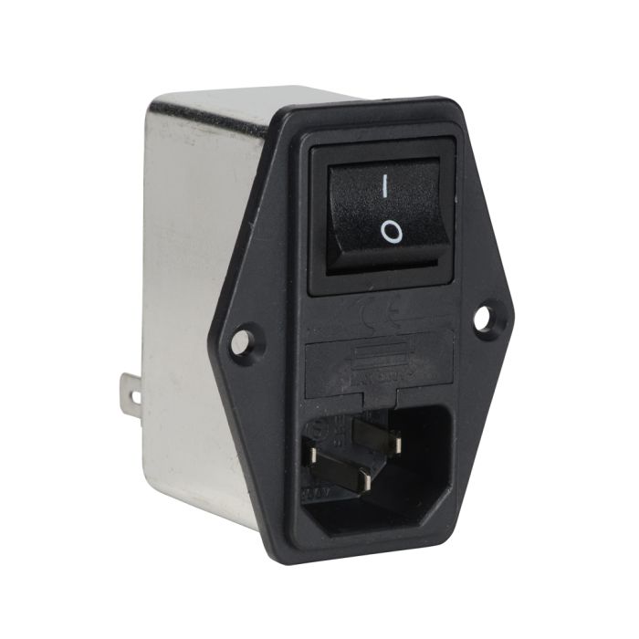 Roxburgh IEC inlet filter, 120/240 VAC, 1-phase, 6A, on/off switch, fused, screw mount, EMI/RFI filtering, 1-stage, general purpose, standard performance, 1/4in quick-disconnect.