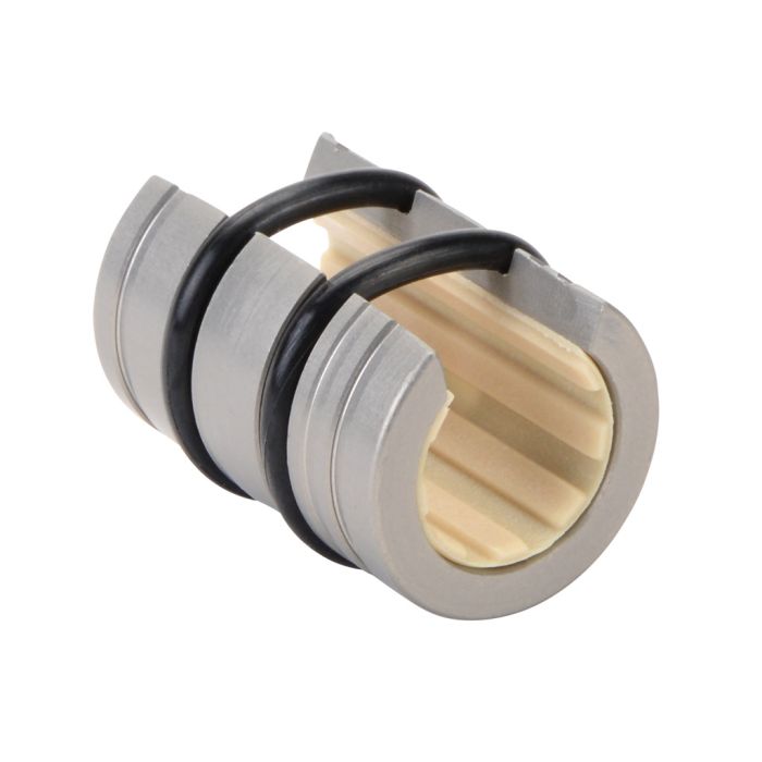 igus DryLin R series plain bearing, type J polymer bearing, 1/2in inside diameter, self-aligning housing, open, anodized aluminum.