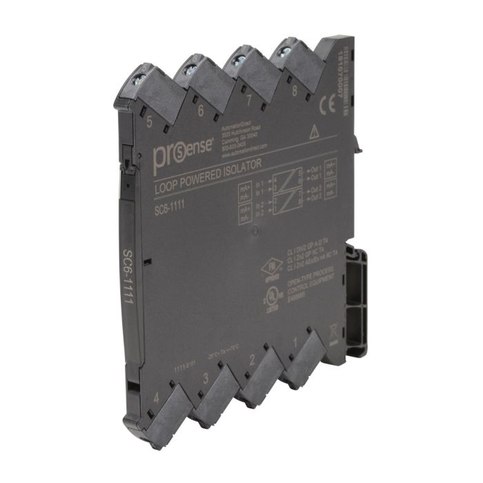 ProSense signal conditioner, (2) isolated channels, loop powered current input, current output, 35mm DIN rail mount, screw terminals.