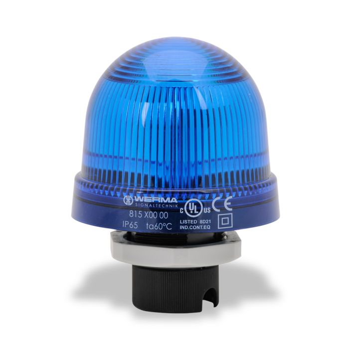 WERMA incandescent industrial signal beacon, 75mm, blue, permanent, IP65, 37mm (PG 29) mount, 12-240 VAC/VDC. Requires incandescent bulb.