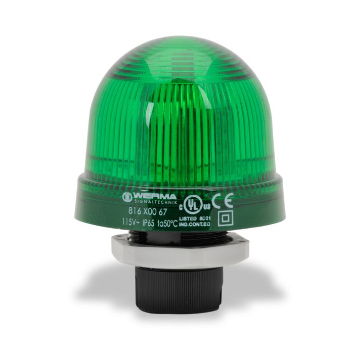 WERMA LED industrial signal beacon, 75mm, green, permanent, IP65, 37mm (PG 29) mount, 115 VAC.