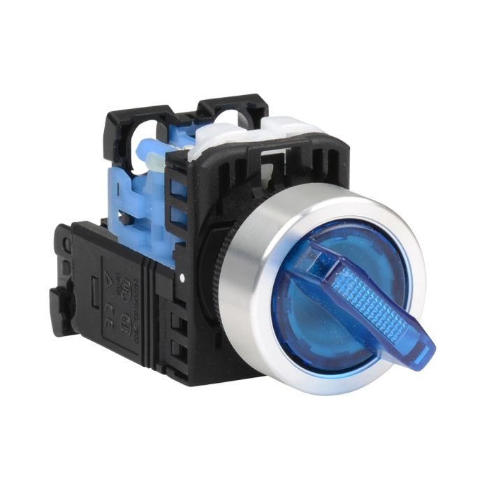 Fuji Electric selector switch, 22 mm, 2-position, maintained, LED illuminated, 1 N.O. contact(s), metal bezel, Operator: blue, knob, 30 mm, round, plastic, 115-127 VAC, transformer.