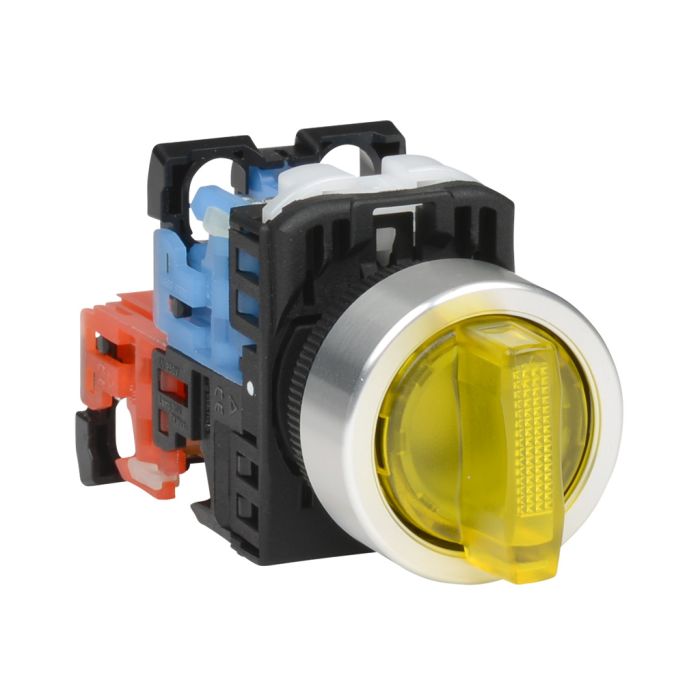 Fuji Electric selector switch, 22 mm, 3-position, spring return to center from left, maintained right, LED illuminated, 1 N.O./1 N.C. contact(s), metal bezel, Operator: yellow, knob, 30 mm, round, plastic, 24 VAC/DC, full voltage.