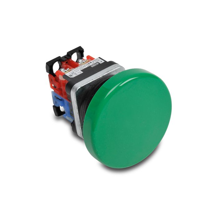 Fuji Electric pushbutton, 30mm, momentary, 1 N.C./1 N.O. contact(s), metal base, metal bezel, Operator: green, mushroom, 65mm, round, plastic.