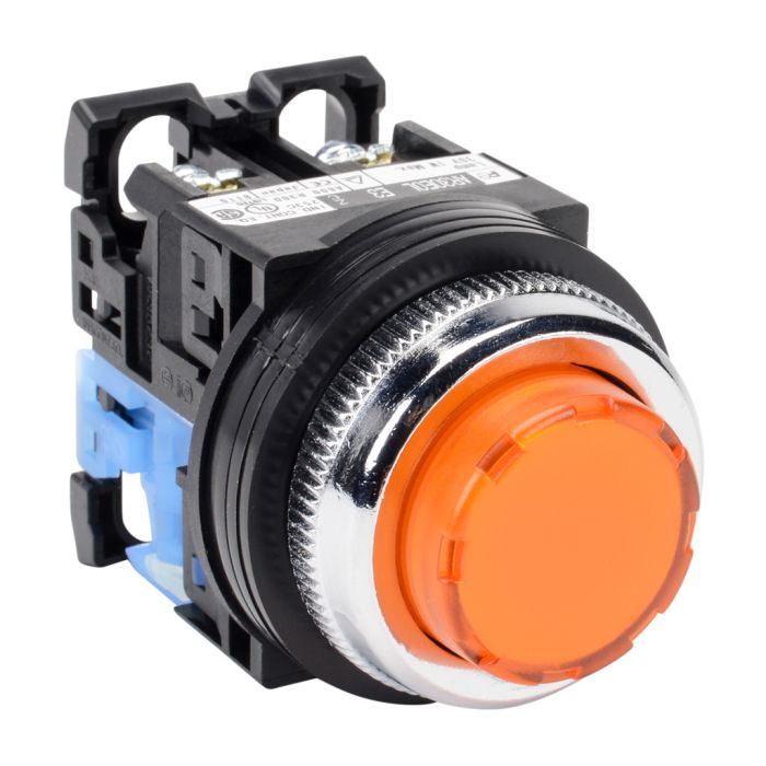 Fuji Electric pushbutton, 30mm, momentary, LED illuminated, 1 N.O. contact(s), plastic base, metal bezel, Operator: orange, extended, 35mm, round, plastic, 24 VAC/VDC, full voltage.