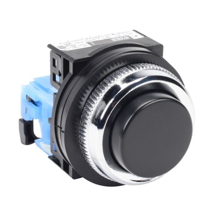 Fuji Electric pushbutton, 30mm, momentary, 1 N.O. contact(s), plastic base, metal bezel, Operator: black, extended, 35mm, round, plastic.